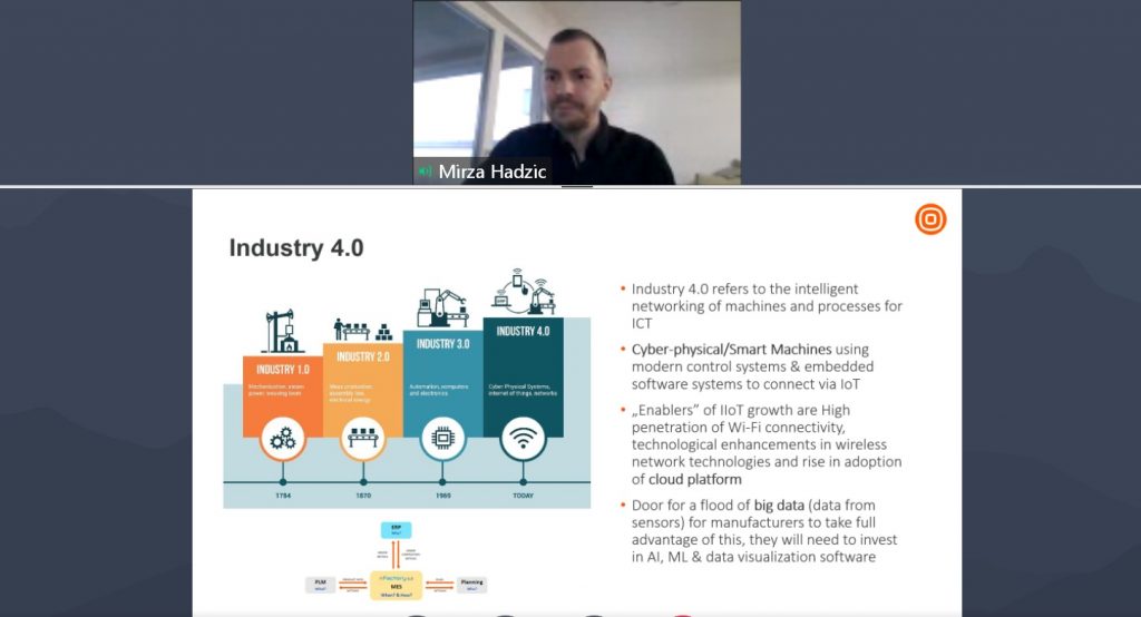 Mirza Hadžić iz tvrtke Infobip d.o.o., brzorastuće startup tvrtke koja se pozicionirala na svjetskom tržištu, osvrnuo se na Industriju 4.0, istaknuvši kako ista obuhvaća inteligentno povezivanje strojeva, procesa i ljudi. . Tehnologija više nije rezervirana samo za velika poduzeća, a produkt revolucije Industrije 4.0 i Internet of Things (IoT) naziva se Industrijski IoT koji danas kreira nove prilike za organizacije od malih tvrtki pa sve do multinacionalnih poduzeća. Prednosti razvoja IoT-a su povećanje produktivnosti, ušteda troškova, trenutna kontrola i brzo otkrivanje potencijalih problema, ali i prilika.