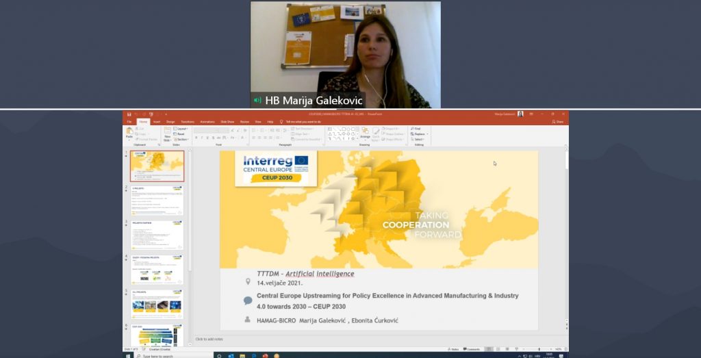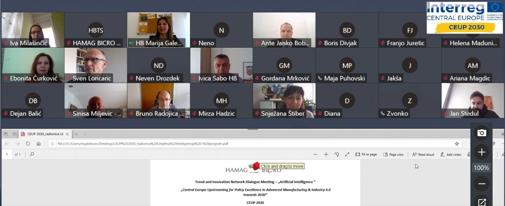 Hrvatska agencija za malo gospodarstvo, inovacije i investicije (HAMAG-BICRO) u sklopu aktivnosti projekta CEUP 2030 (Central Europe Upstreaming for Policy Excellence in Advanced Manufacturing & Industry 4.0 towards 2030) organizirala je virtualnu radionicu na temu Umjetne inteligencije i njezine primjene u poslovanju i industriji koja je okupila iskusne startup poduzetnike s bogatim iskustvom u međunarodnom poslovanju te predstavnike akademske zajednice i kreatore politika u Republici Hrvatskoj.