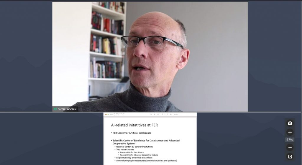 Prof. dr. sc. Sven Lončarić prezentirao je djelovanje Centra za umjetnu inteligenciju Fakulteta elektrotehnike i računarstva Sveučilišta u Zagrebu (FER), pritom naglasivši kako je FER uvijek usmjeren na jačanje veza s tvrtkama, a kao inženjeri usmjereni su ka primjenjivosti njihova rada u stvarnom svijetu. Naglasio je kako su glavne karakteristike promjena koje dolaze s Industrijom 4.0 povezivost i povezanost kroz IoT, eksplozija dostupnih podataka, mogućnost pristupa i prikupljanja podataka, opća povezanost te holistički pristup proizvodnji.